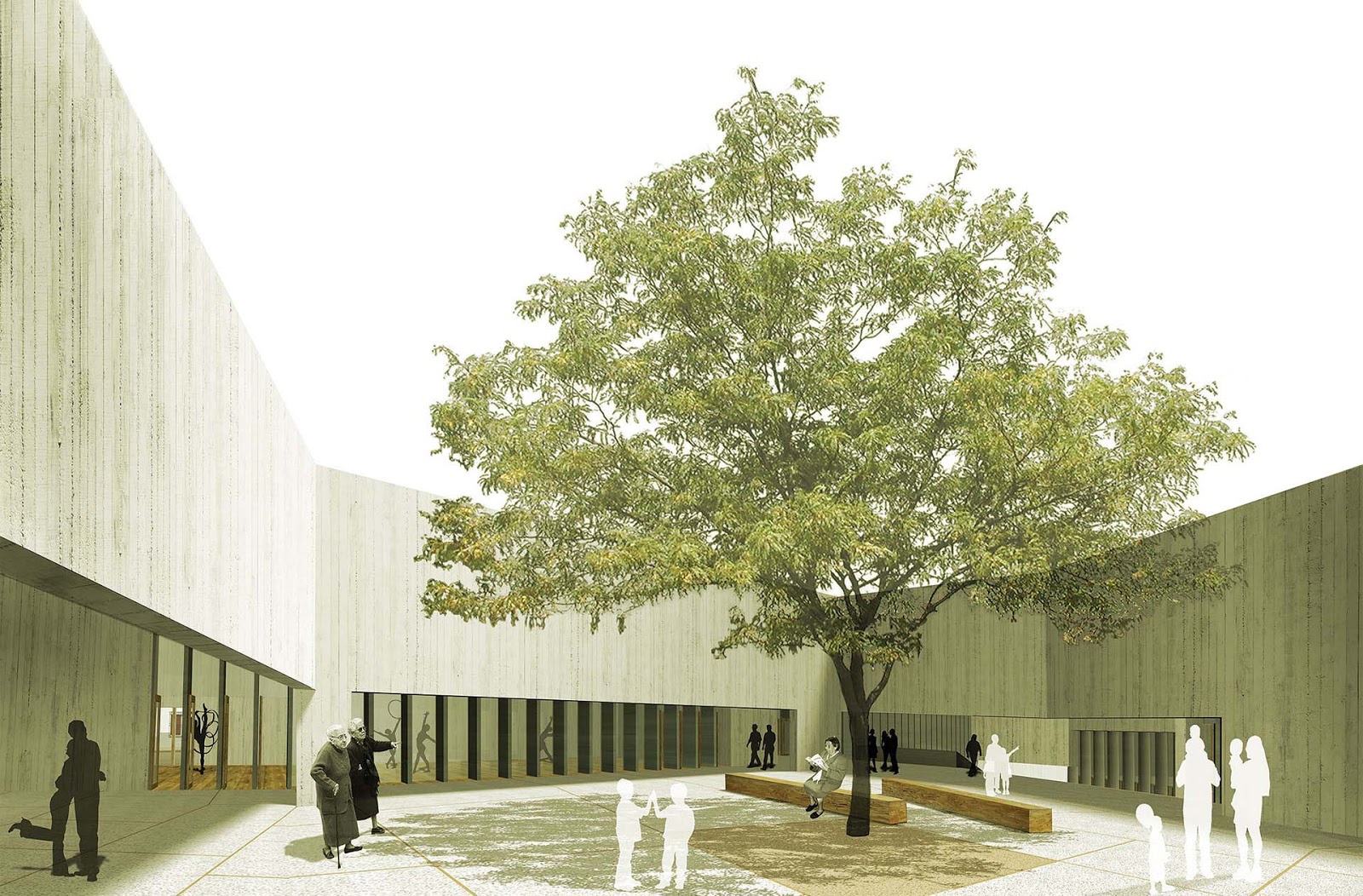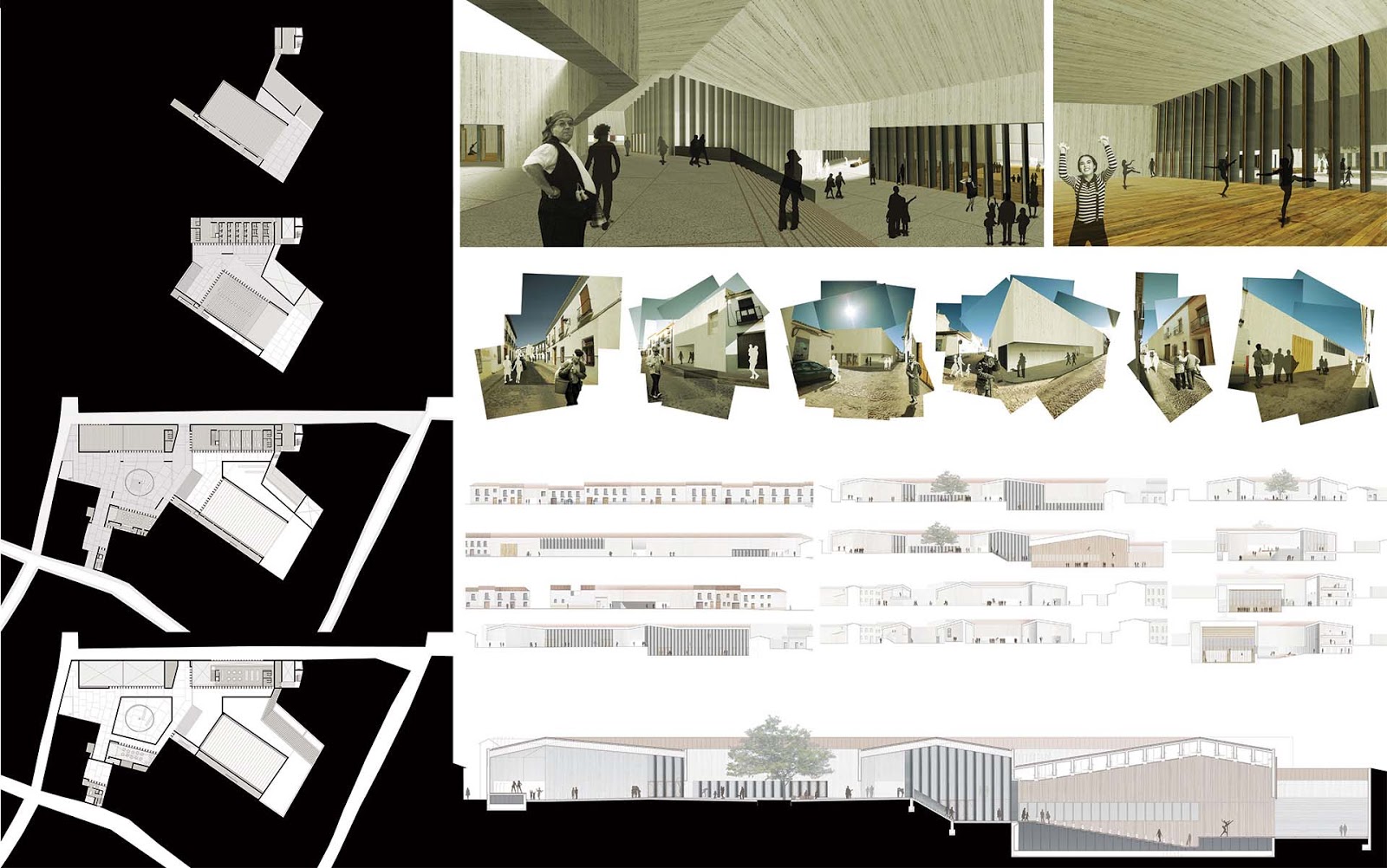 Almagro is a place with a special character: slopped roofs, whitewash walls and patios. The project aims to fit in the city, being respectful with the block and the height of the buildings. The purpose is to create a public route through the building, an open tour with the patio in the center. All the different parts of the theatre are connected through the patio: the nexus that unifies the project. In this a way, the interior square is the element that connects and oxygenates everything, it is the lung of the building. Thus, we need a tree to inhabit the place. The tree is now the center of the project, it becomes a clear reference, a milestone in the patio. This alive item organises everything: it takes care of the public route, observes the entrance of the theatre, the training rooms, the café and the educational area. Related to the theatre, the project aims to get a versatile theatrical space, capable to host all kind of shows. The theatrical space offers the possibility to adapt to several situations: it can be used to represent classical productions, concerts or innovative shows. The different transformations of the cloister generate informal stages where urban performances can happen.