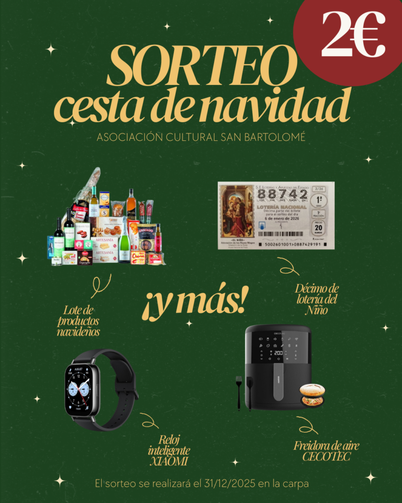 Este año, además de una completa cesta compuesta por una amplia variedad de producto , entre ellos: bebidas, embutidos, conservas, turrones y otros dulces, también incluimos un décimo de Lotería del Niño, una freidora de aire CECOTEC, un reloj inteligente XIAOMI y alguna sorpresa más.